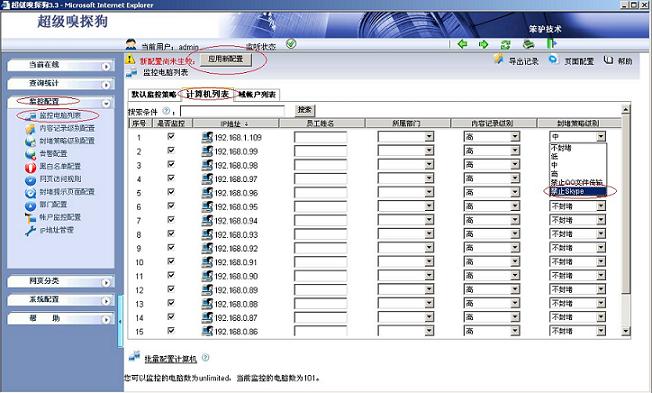 (3)在“監控配置-- >監控電腦列表-- >計算機列表”中應用封堵規則,如下圖所示: