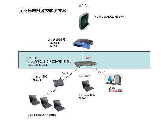 在本例中,為了能同時對有線環境的機器和無線環境的機器進行監控。我們增加了一個TPLINK的鏡像交換機(TL-SL2210WEB)。并且需要對無線AP進行設置。 如上圖中框內部分。