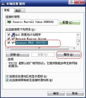 2. 選中“Internet協議(TCP/IP)”,點擊“屬性”按鈕,彈出“Internet協議(TCP/IP)屬性”對話框。