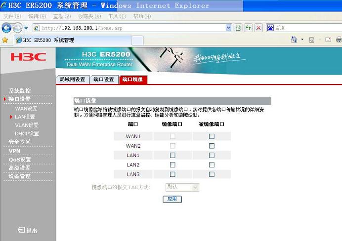 利用H3C ER5200的端口鏡像功能配置,然后用超級嗅探狗網絡監控軟件實現局域網監控。 如圖所示: