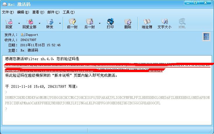 如果您選擇通過郵件的方式來激活您的產品,在對話框中輸入您購買時獲得的注冊碼,選擇郵件激活,點擊確定,頁面將返回一串激活碼,將激活碼的內容通過郵件的方式發送到指定的郵箱中,公司將在兩個工作日內將驗證碼發給您,把收到的驗證碼輸入到系統,即可完成激活。