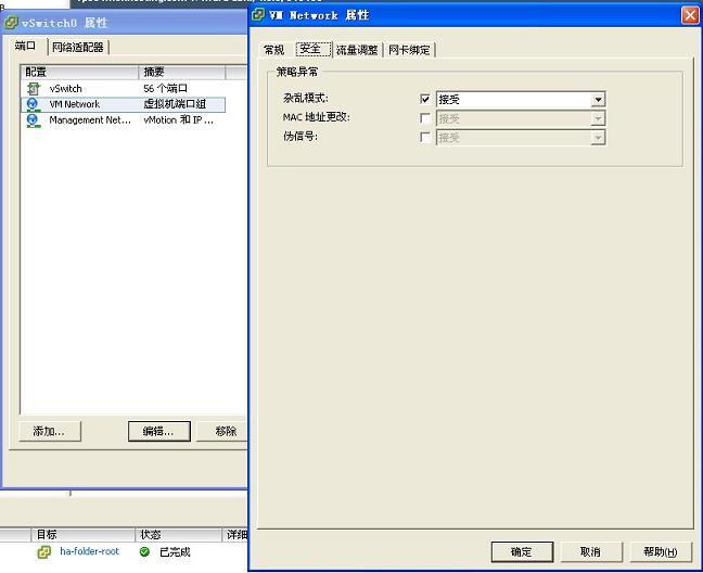 監(jiān)控主機(jī)所在兩塊網(wǎng)卡連接的虛擬交換機(jī)都要允許“雜亂模式”。