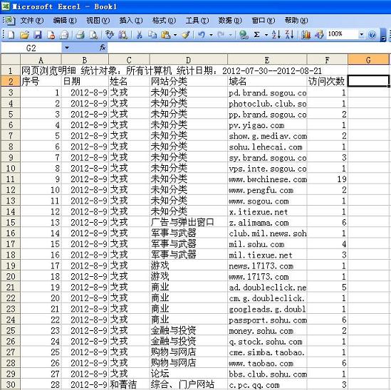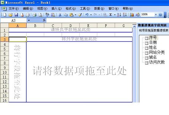 步驟4:將右邊數據透視表字段列表中的字段(姓名、網站分類、域名)雙擊添加,并把“訪問次數”在下拉列表中選擇添加到“數據域”,在左邊的區域中將會顯示統計后的結果。具體結果如下圖所示: