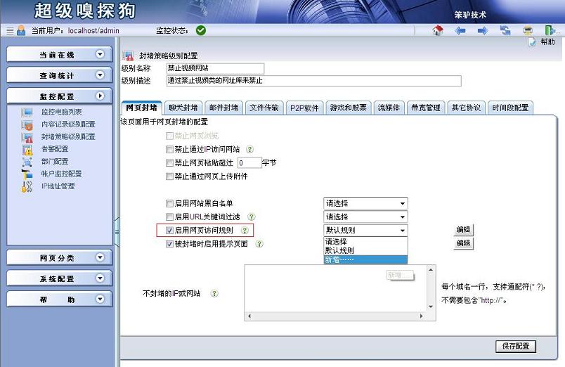 首先,您需要在監(jiān)控配置->封堵策略級別配置中,新增一個封堵策略級別,取名為“禁止視頻網(wǎng)站”,在網(wǎng)頁封堵選項卡中,勾選“啟用網(wǎng)頁訪問規(guī)則”,并在后面的下拉列表中,點擊“新增”。具體如下圖所示: