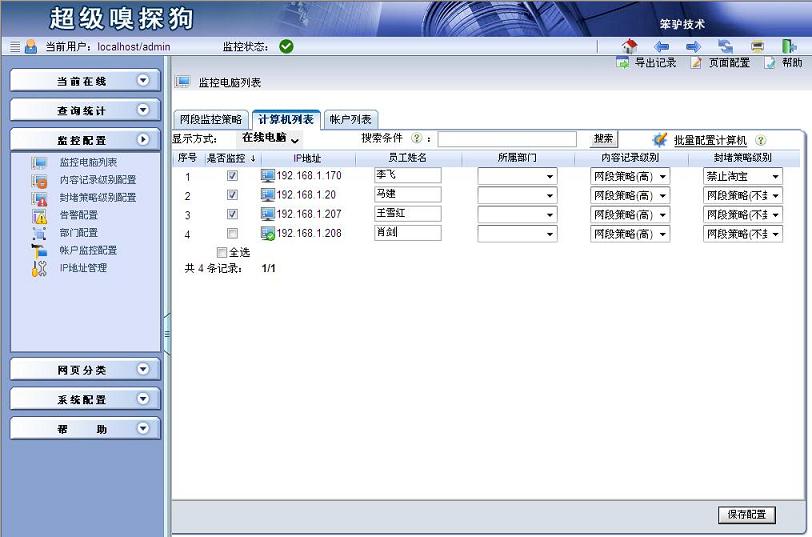步驟四:選擇監控配置->監控電腦列表,進入“監控電腦列表”界面,點擊“計算機列表”選項卡,為計算機設置封堵策略級別。具體如下圖所示: