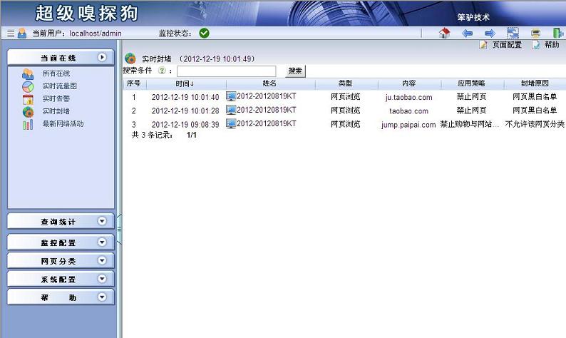 步驟六:選擇當前在線->實時封堵,進入“實時封堵”界面,可以看到已經被禁止訪問的網站的記錄。具體如下圖所示: