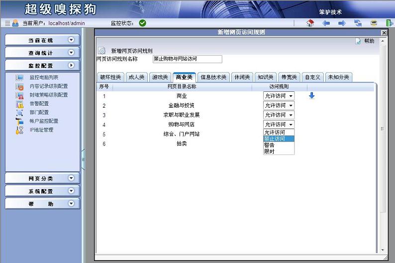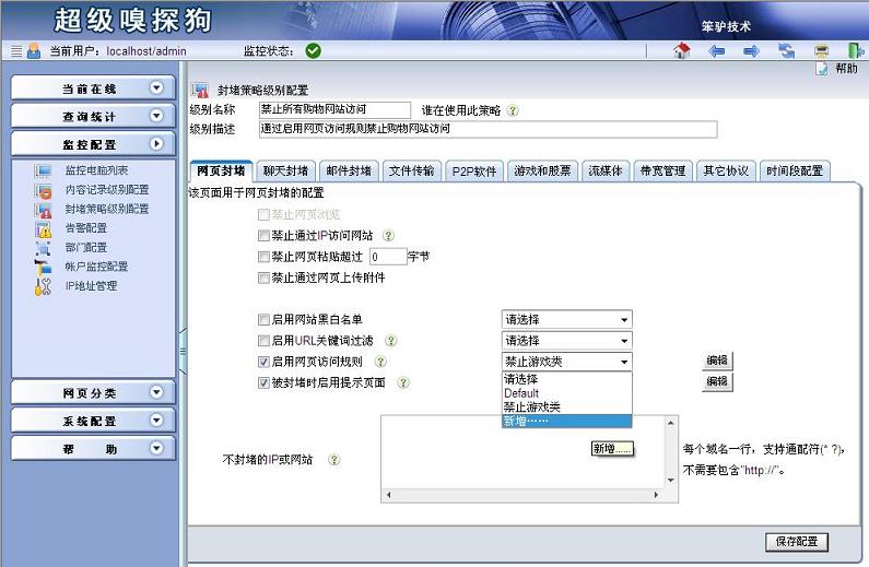 步驟二:彈出“新增網頁訪問規則”,輸入“網頁訪問規則名稱”,點擊“商業類”選項卡,在“購物與網店”后的下拉列表中選擇“禁止訪問”。點擊“保存配置”。具體如下圖所示: