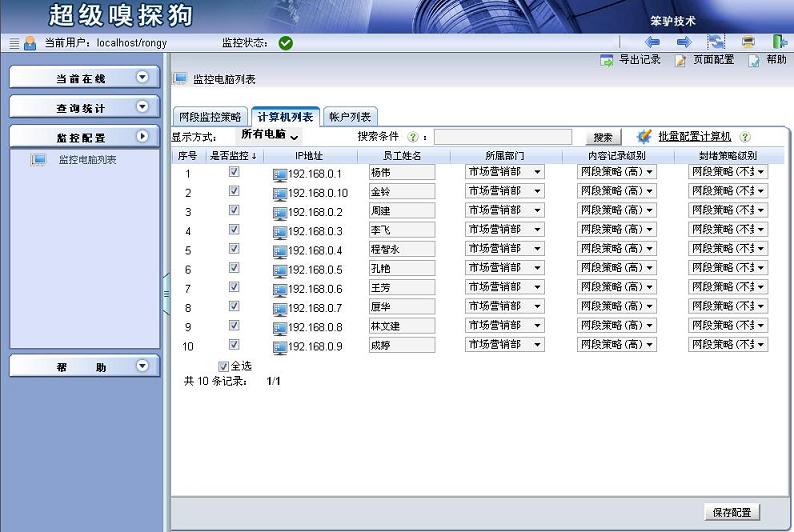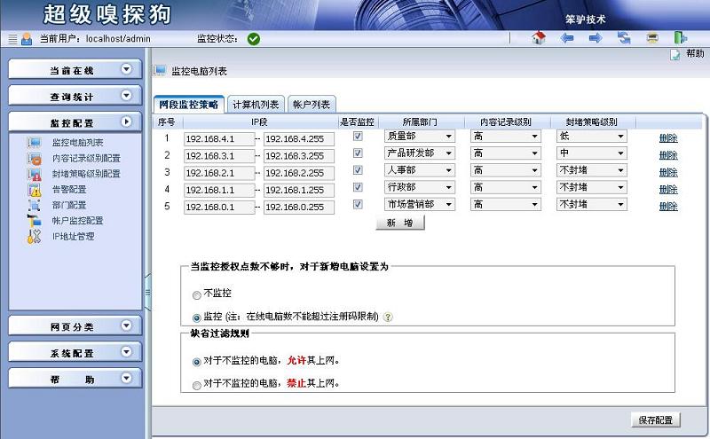 步驟3:點擊監(jiān)控配置->監(jiān)控電腦列表,進入“監(jiān)控電腦列表”界面,單擊切換到“網(wǎng)段監(jiān)控策略”選項卡,可以為每個部門選擇不同的封堵策略級別。具體如下圖所示: