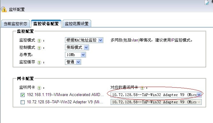 - 4. 點擊“系統(tǒng)配置”—>“監(jiān)聽配置”—>“監(jiān)控設(shè)備配置”,選擇新添加的網(wǎng)卡作為通訊網(wǎng)卡。