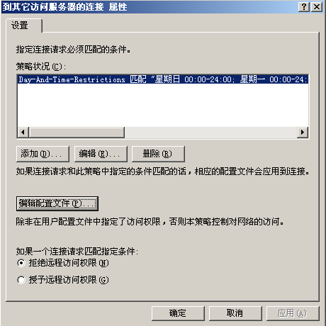 進(jìn)入到遠(yuǎn)程訪問(wèn)策略,右擊系統(tǒng)自帶的遠(yuǎn)程訪問(wèn)策略,點(diǎn)擊屬性,在屬性頁(yè)面中點(diǎn)擊編輯配置文件。([FONT-COLOR=Red]注:系統(tǒng)自帶兩個(gè)訪問(wèn)策略,都要設(shè)置。[/FONT-COLOR])