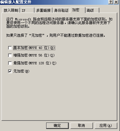 在編輯撥入配置文件頁(yè)面中點(diǎn)擊加密選項(xiàng)卡,去掉加密,選中“無(wú)加密”。