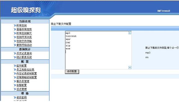如果是要禁止從網頁上面下載文件,需要在超級嗅探狗的封堵級別里面啟用“下載文件控制”,然后把不允許下載的文件類型添加在“下載文件控制”列表中。如下圖所示: