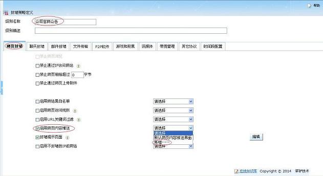 輸入級(jí)別名稱以及級(jí)別描述,(如:公司官網(wǎng)通知),選中網(wǎng)頁封堵選項(xiàng)卡,選擇“啟用網(wǎng)頁推送” ,點(diǎn)擊新增。