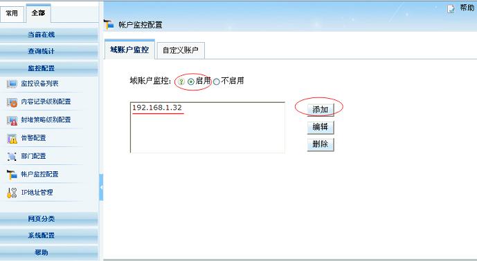 在“帳戶監控配置”頁面中,選擇“域賬戶監控”,點擊“啟用”,新增一個域控制器。