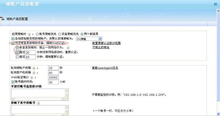 點擊“高級配置”,將“對沒有登錄到域的設備,強制web認證”,勾選上,保存配置。根據需要,可以將“未登錄到域時,禁止一切網絡行為”以及“超過30 分鐘沒有網絡活動時,重新認證 ”,勾選上。
