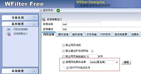 如圖所示,啟用網(wǎng)站黑白名單,并且勾選“對HTTPS站點生效”,即可禁止黑白名單中的站點。不管是HTTP還是HTTPS站點都將被禁止掉。
