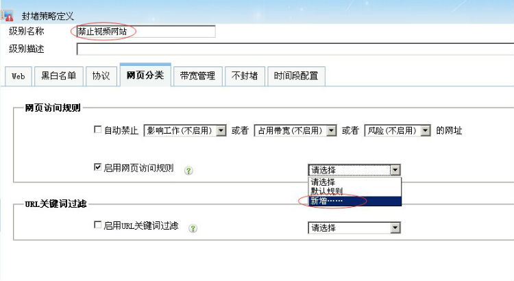 1.首先,您需要在監(jiān)控配置->封堵策略級別配置中,新增一個封堵策略級別,在網(wǎng)頁分類選項(xiàng)卡中,勾選“啟用網(wǎng)頁訪問規(guī)則”,并在后面的下拉列表中,點(diǎn)擊“新增”,并保存配置。具體如下圖所示: