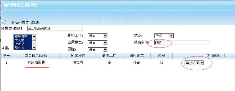 2.彈出的“編輯網(wǎng)頁訪問規(guī)則”界面,搜索“視頻”,將音樂與視頻設(shè)為禁止訪問,并保存配置。具體如下圖所示: