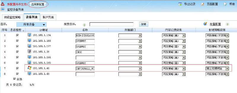 3.然后,在監(jiān)控配置->監(jiān)控電腦列表中,對需要禁止其訪問視頻網(wǎng)站的電腦使用該封堵策略即可。具體如下圖所示: