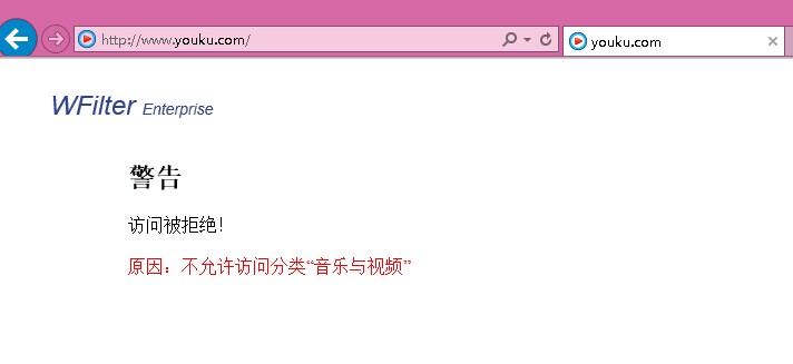 4.當(dāng)被實(shí)施該封堵的電腦訪問您所禁止的視頻網(wǎng)站時(shí),會出現(xiàn)以下封堵頁面: