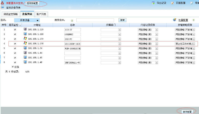 4.在“監(jiān)控配置-監(jiān)控設(shè)備列表”中應(yīng)用該封堵策略級(jí)別,如下圖所示: