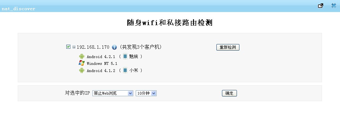 如圖配置后,使用該隨身WiFi的手機(jī)客戶(hù)端瀏覽器在打開(kāi)網(wǎng)站時(shí),會(huì)提示被禁止。但是微信、QQ等并不能被禁止掉,建議采用下述的“隨身wifi和私接路由檢測(cè)”插件進(jìn)行配合。