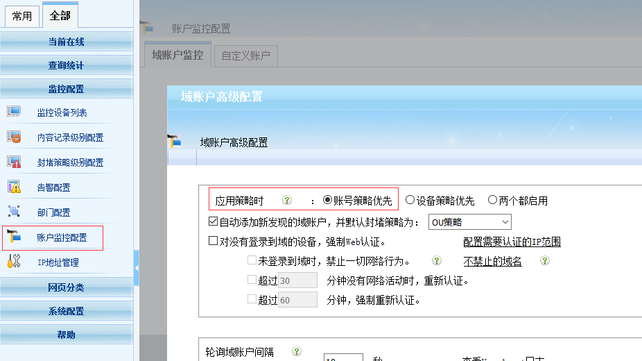 3. 在”賬號監控設置“的高級設置中,把”策略應用“選擇為”賬號策略優先“。
