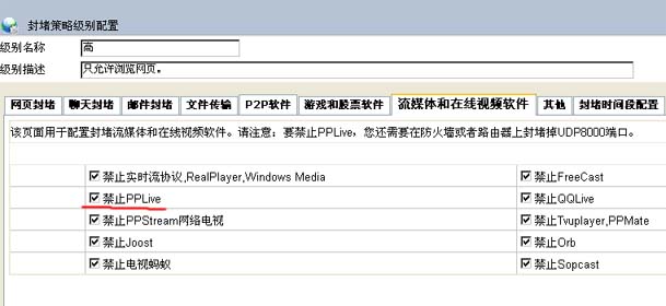 PPLive等流媒體軟件采用了P2P技術進行通訊,會占用大量帶寬。 超級嗅探狗3.2版本中加強了對相關軟件的支持,可以分時段禁止常用的PPLIVE, QQ直播,PPStream等軟件。 一機安裝即可管理全網。 如下圖: