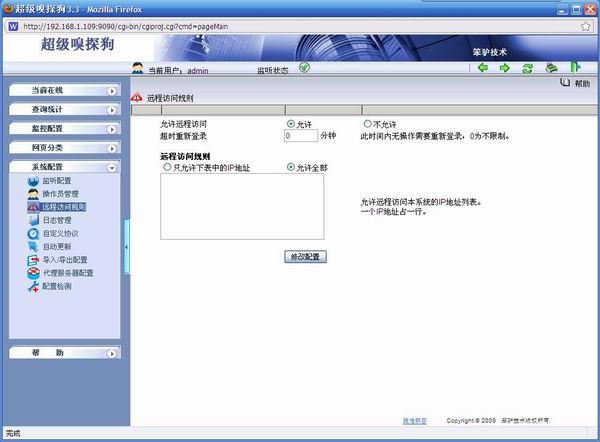 超級嗅探狗支持遠(yuǎn)程登陸功能,不需要安裝客戶端程序,只要您知道安裝嗅探狗的IP并且有相應(yīng)權(quán)限,就可以通過瀏覽器直接訪問。