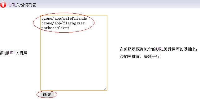 3.添加URL關鍵詞qzone/app/salefriends,qzone/app/flashgames和parker/client,如下圖所示: