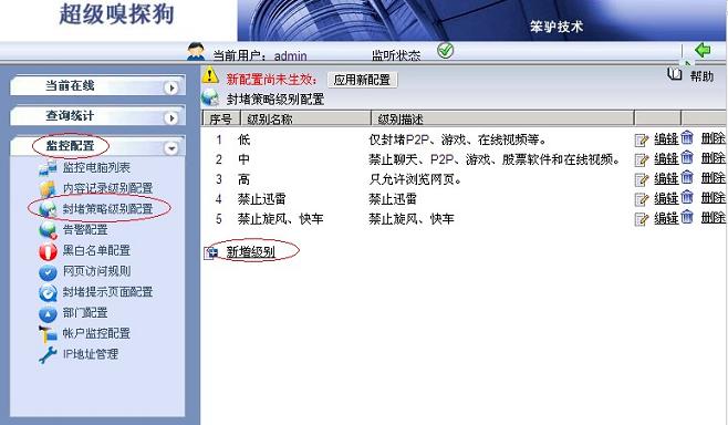 4.在“監控配置-- >封堵策略級別配置中”新增級別,如下圖所示: