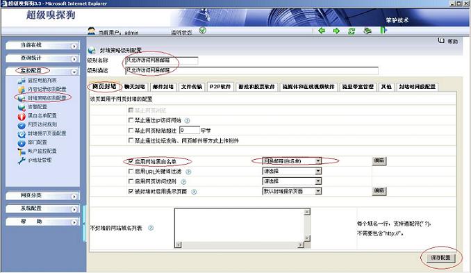 1.打開超級(jí)嗅探狗“監(jiān)控配置-- >封堵策略級(jí)別配置-- >新增封堵級(jí)別”,具體配置如下圖所示: