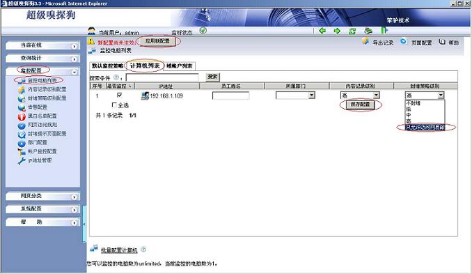 3.在“監(jiān)控配置-- >監(jiān)控電腦列表”中應(yīng)用封堵策略,如下圖所示: