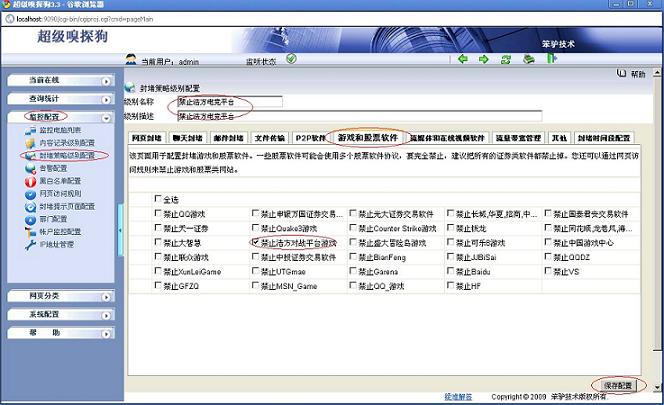 [B]1.2 浩方電競平臺的通訊端口介紹[/B] 浩方電競平臺登錄采用TCP 通訊方式,登錄端口為1201 和1203,TCP 1201 端口用于登錄驗證通訊,TCP 1203 端口用于游戲大廳和好友信息通訊等。浩方對戰平臺游戲通訊數據采用UDP 通訊方式。當1201 或1203 端口不通時,則登錄失敗。 [B]2.如何禁止浩方電競平臺?[/B] [B]2.1 通過封端口的方式來禁止浩方電競平臺[/B] 通過以上的介紹可以看出,要想禁止浩方電競平臺只需要在路由器上面禁止其所有的通訊端口就可以實現。 [B]2.2 通過超級嗅探狗禁止浩方電競平臺[/B] 下面演示一下使用WFilter(超級嗅探狗)禁止浩方電競平臺的具體步驟: (1)打開超級嗅探狗,在“監控配置-->封堵策略級別配置-->編輯-->禁止浩方電競平臺”,配置如下圖所示 [ALIGN-CENTER] [/ALIGN-CENTER] (2)在“監控配置--> 監控電腦列表--> 計算機列表”中應用封堵策略,如下圖所示: [ALIGN-CENTER][/ALIGN-CENTER] (3)封堵效果如下圖所示: [ALIGN-CENTER][/ALIGN-CENTER] 在百度中搜索超級嗅探狗的相關信息