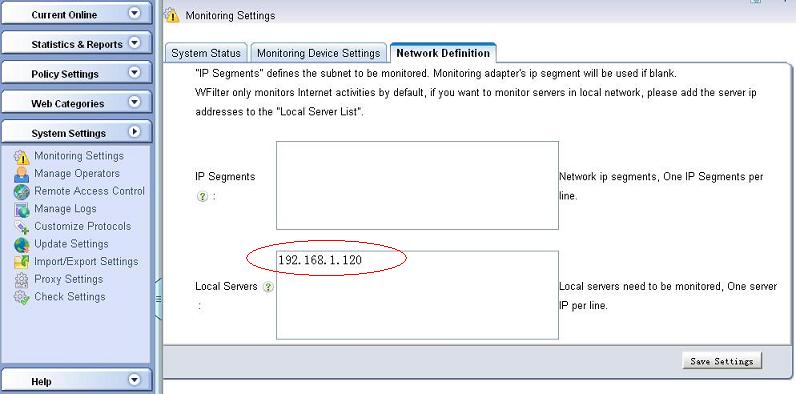Because WFilter only monitors the internet traffic in default, to get it work, you also need to add the proxy server's ip address into the "Local Servers" settings in "System Settings"->"Monitoring Settings" of WFilter. In this example, let's suppose the proxy server ip address is "192.168.1.120".